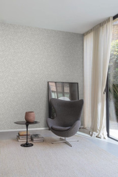 Vliesová tapeta - svislé proužky přírodních vláken, šedo-stříbrný rostlinný motiv.