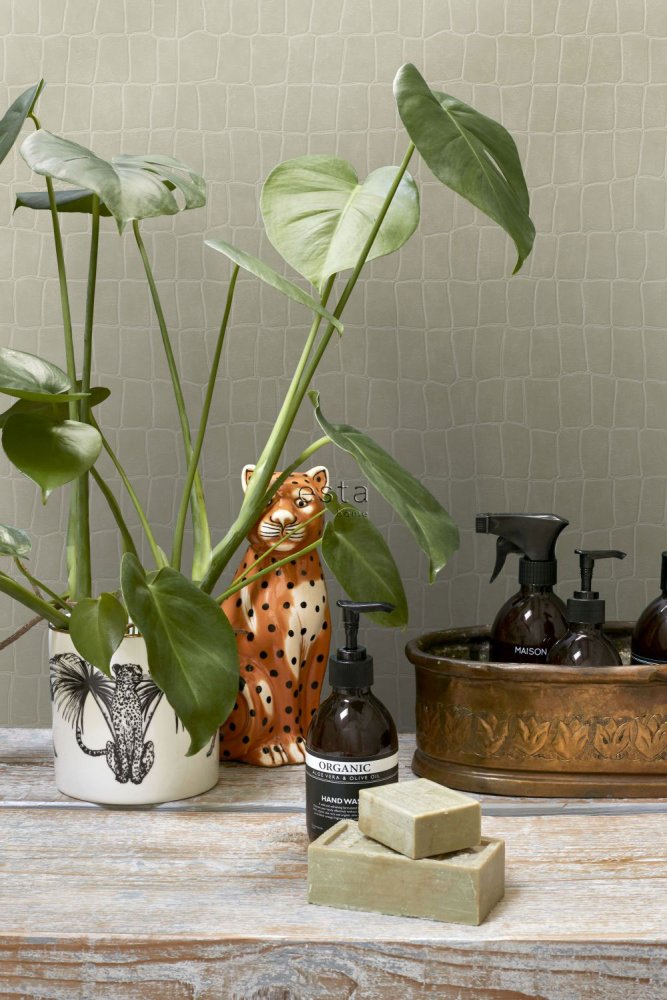 Šedo-zelená vliesová tapeta na zeď, imitace zvířecí kůže.