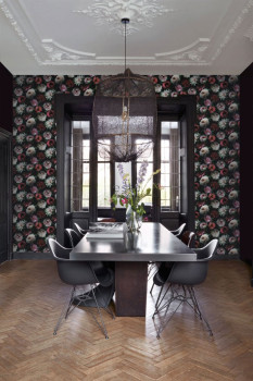 Vliesová tapeta s růžovými květinami na černém podkladu.