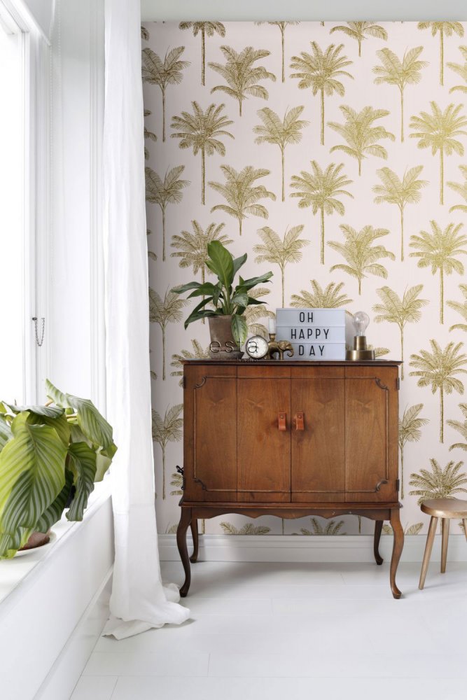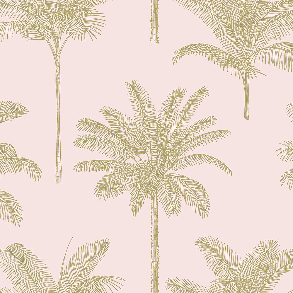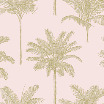 Růžová vliesová tapeta na zeď, zlaté obrysy palem.