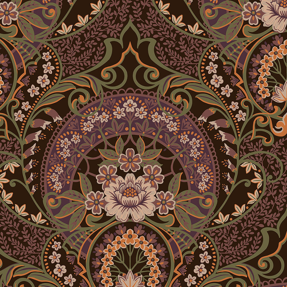 Výrazný květinový vzor v pastelových tónech olivové, oranžové, petrolejové.