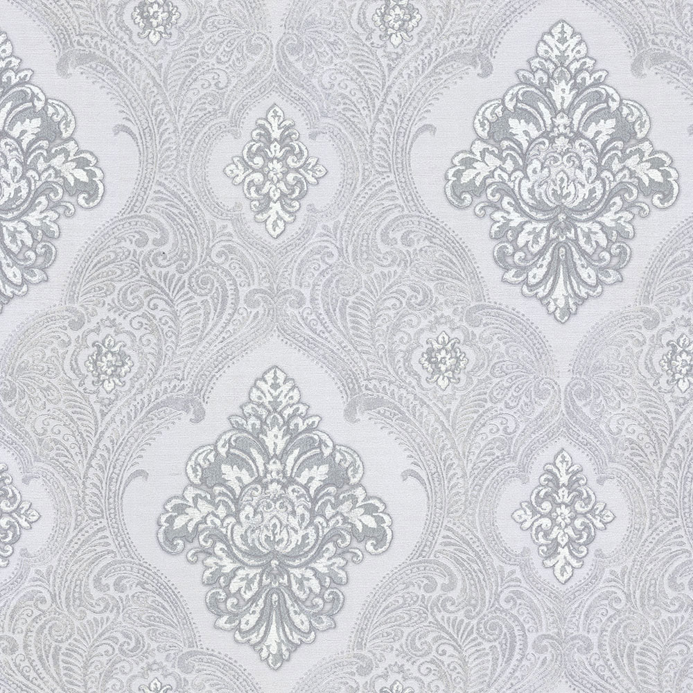 Šedo stříbrná luxusní vliesová zámecká tapeta s výrazným ornamentálním vzorem.