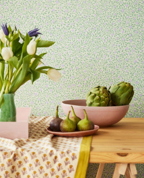 Vliesová tapeta na zeď - něžný květinový vzor dodá interiéru jemnost. Světle zelený podklad s fialovými kvítky.