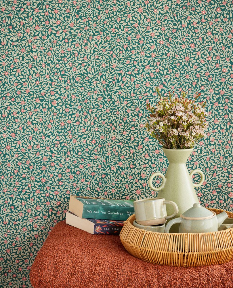 Zelený podklad s růžovými kvítky dodá interiéru jemnost - vliesová tapeta na zeď.