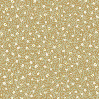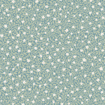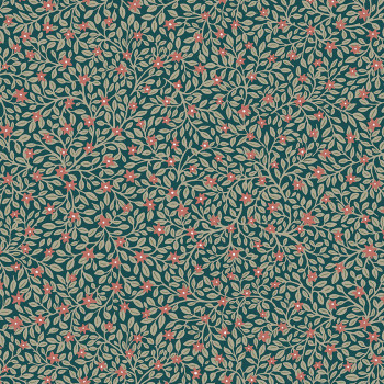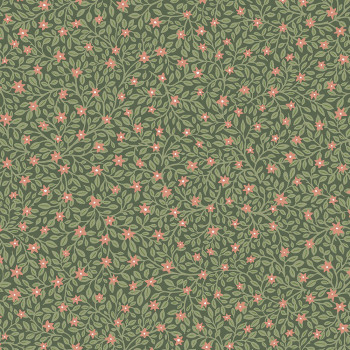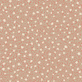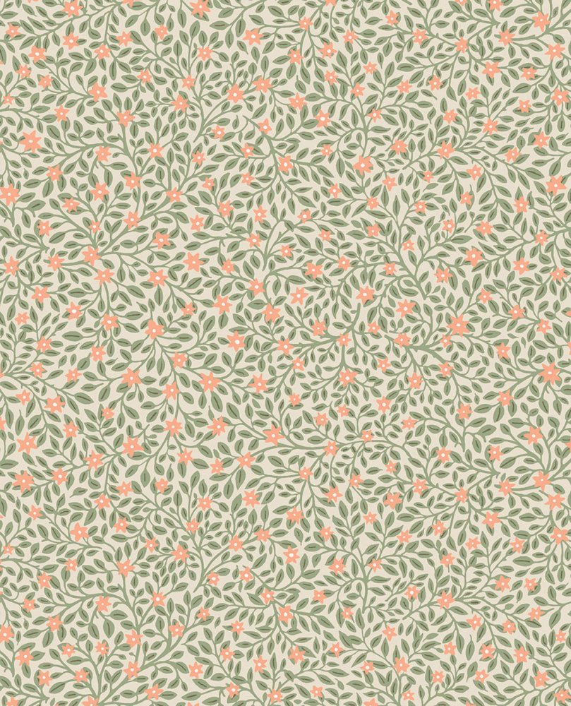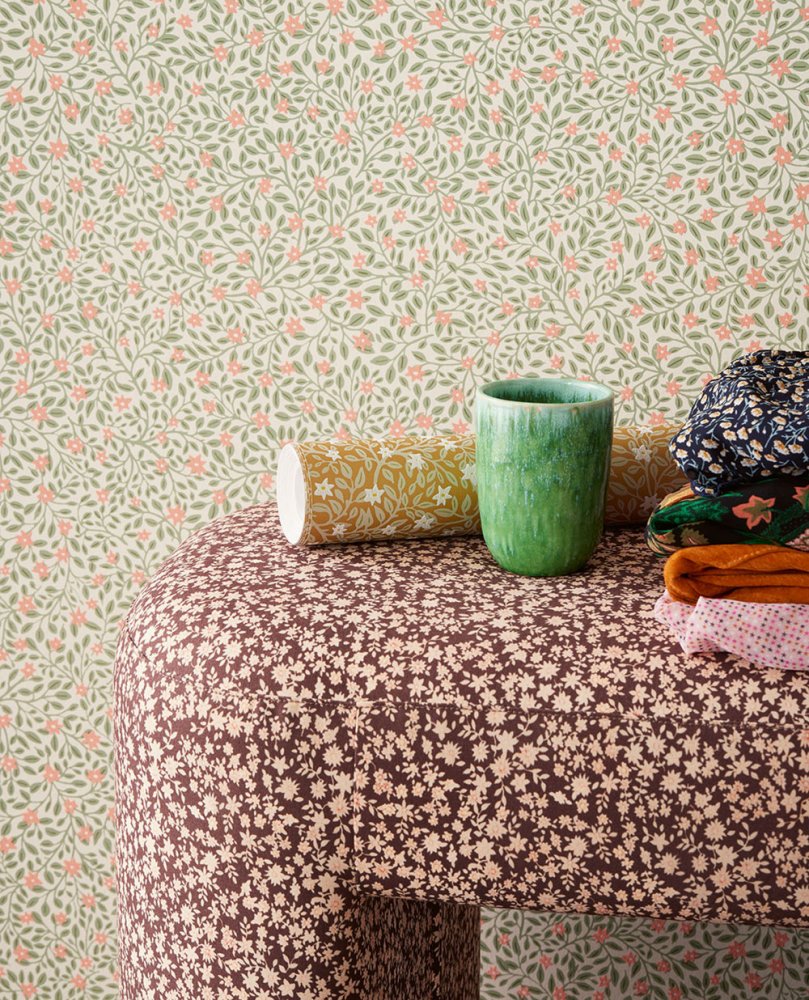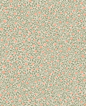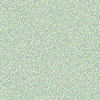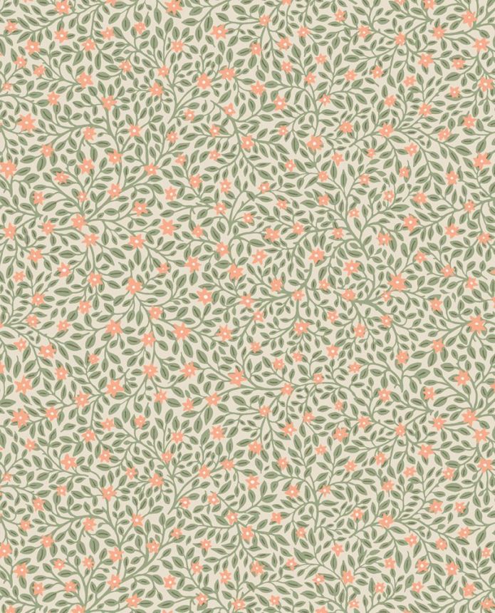 Romantická tapeta s drobnými růžovými květy a zelenými lístky na světle zeleném podkladu.