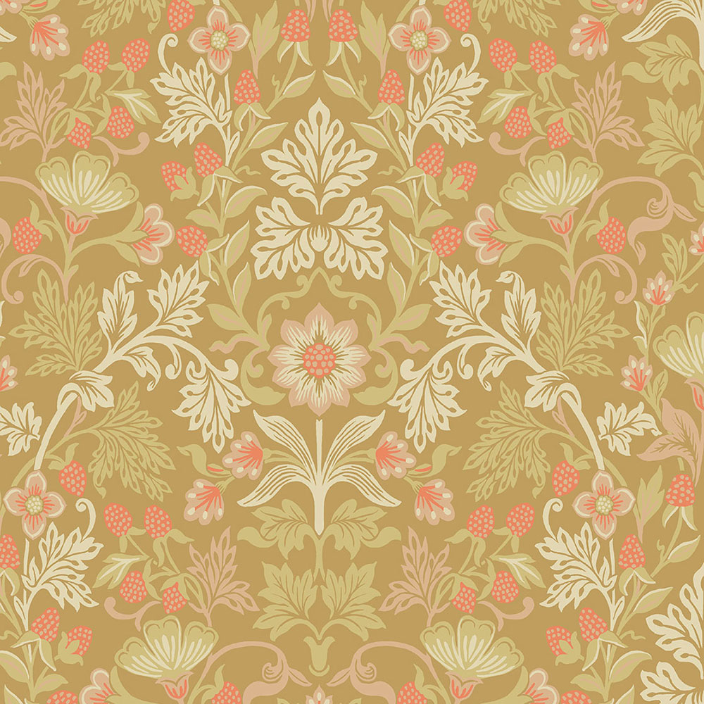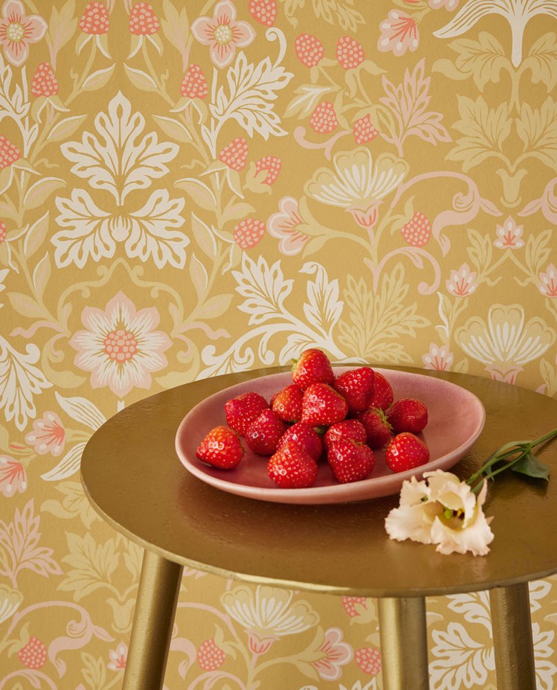 Ornamentální květinová tapeta na tmavě modrém podkladu s přírodními motivy v béžové a okrové barvě.