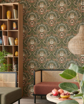 Výrazný květinový vzor v pastelových tónech hnědé, zelené, béžové a cihlové.