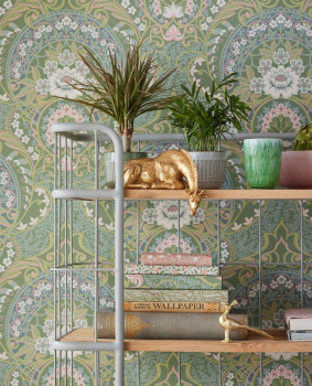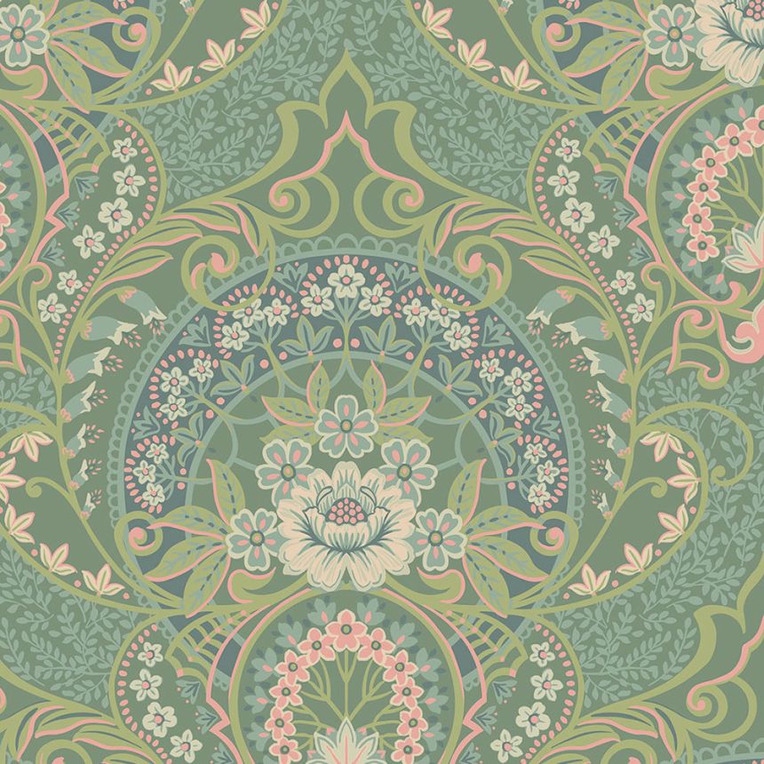 Výrazný květinový vzor v barvách zelené, petrolejové, růžové a bílé.