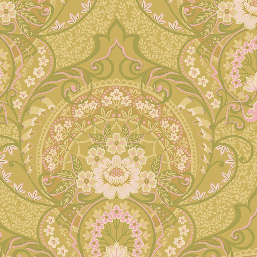 Výrazný květinový vzor v jemných tónech okrové, růžové, zelené a bílé.