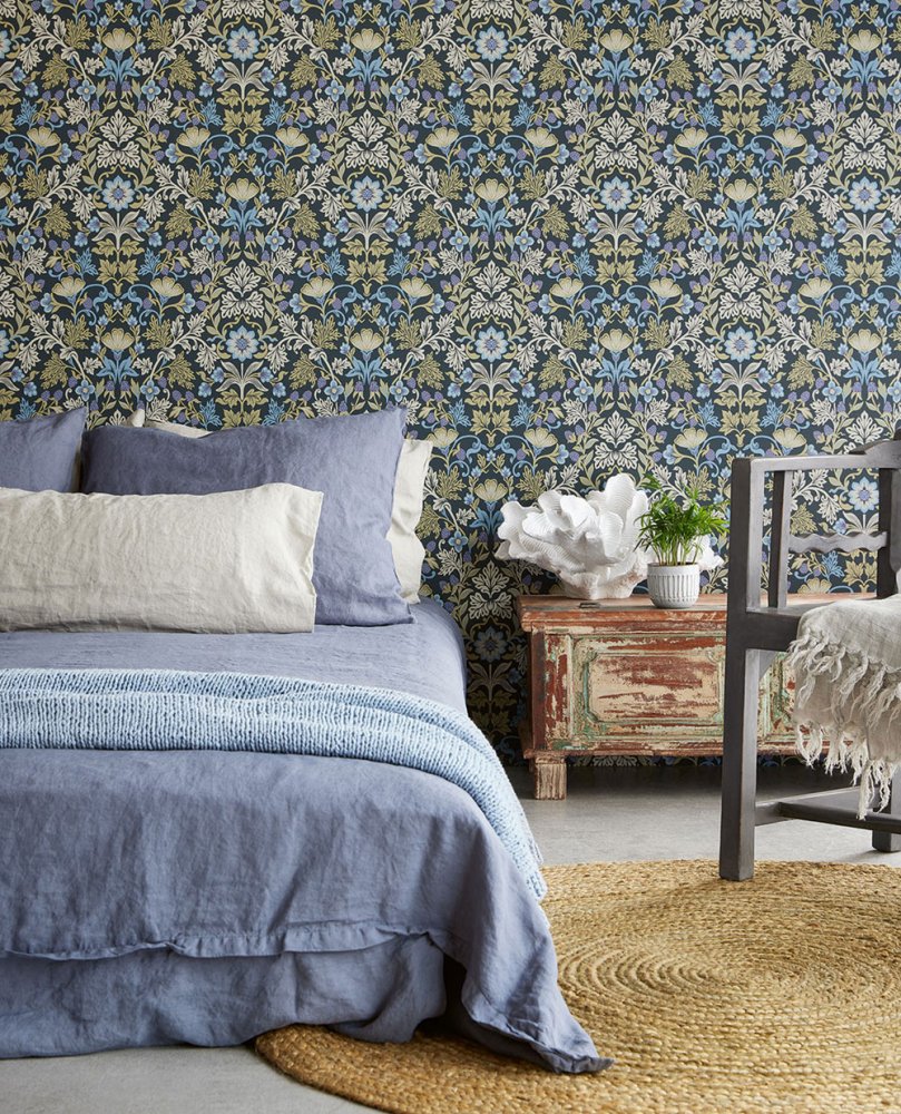 Ornamentální květinová tapeta na tmavě modrém podkladu s přírodními motivy v modré a fialové barvě.