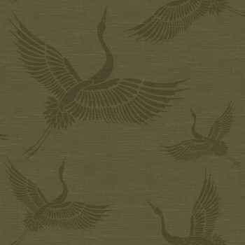 Vliesová zelená/khaki tapeta - ptáci, jeřábi - látková textura 347758, Natural Fabrics, Origin