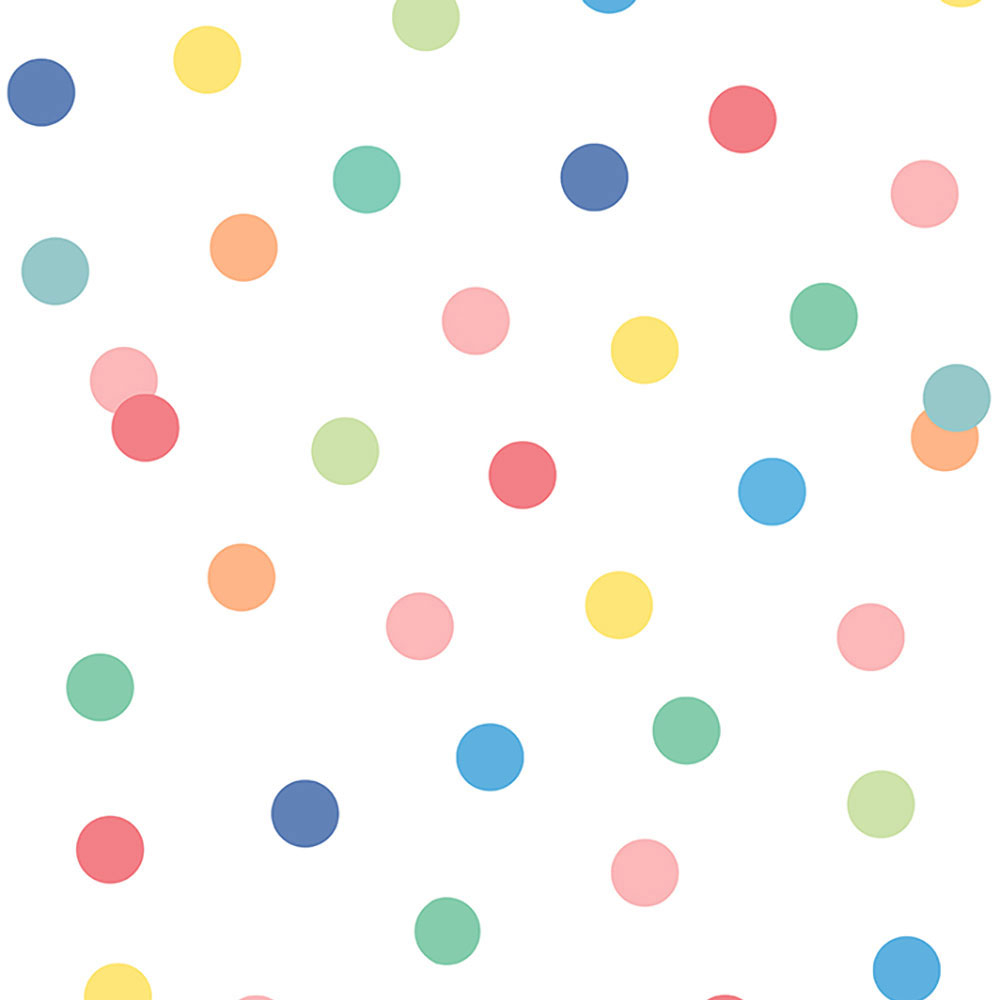 Bílá vliesová tapeta s barevnými puntíky.