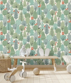 Vliesová dětská tapeta na zeď - motivy lesních zvířátek a lesa.