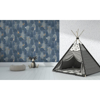 Vliesová dětská modrá tapeta - motivy lesních zvířátek a lesa.