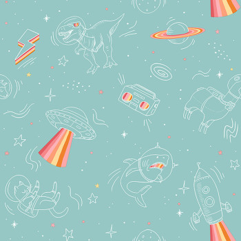 Vliesová zelená dětská tapeta - zvířátka a dinosauři ve Vesmíru - M36804, My Kingdom, Ugépa