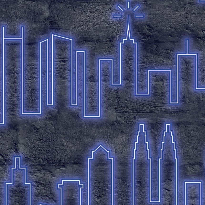 Neonová tapeta na zeď - obrysy New Yorkských budov z modrých třpytek září ve tmě.