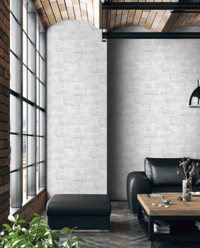 Šíře role 1,06m. Vliesová omyvatelná tapeta na zeď, dekor šedo-bílé cihly, cihlové zdi.