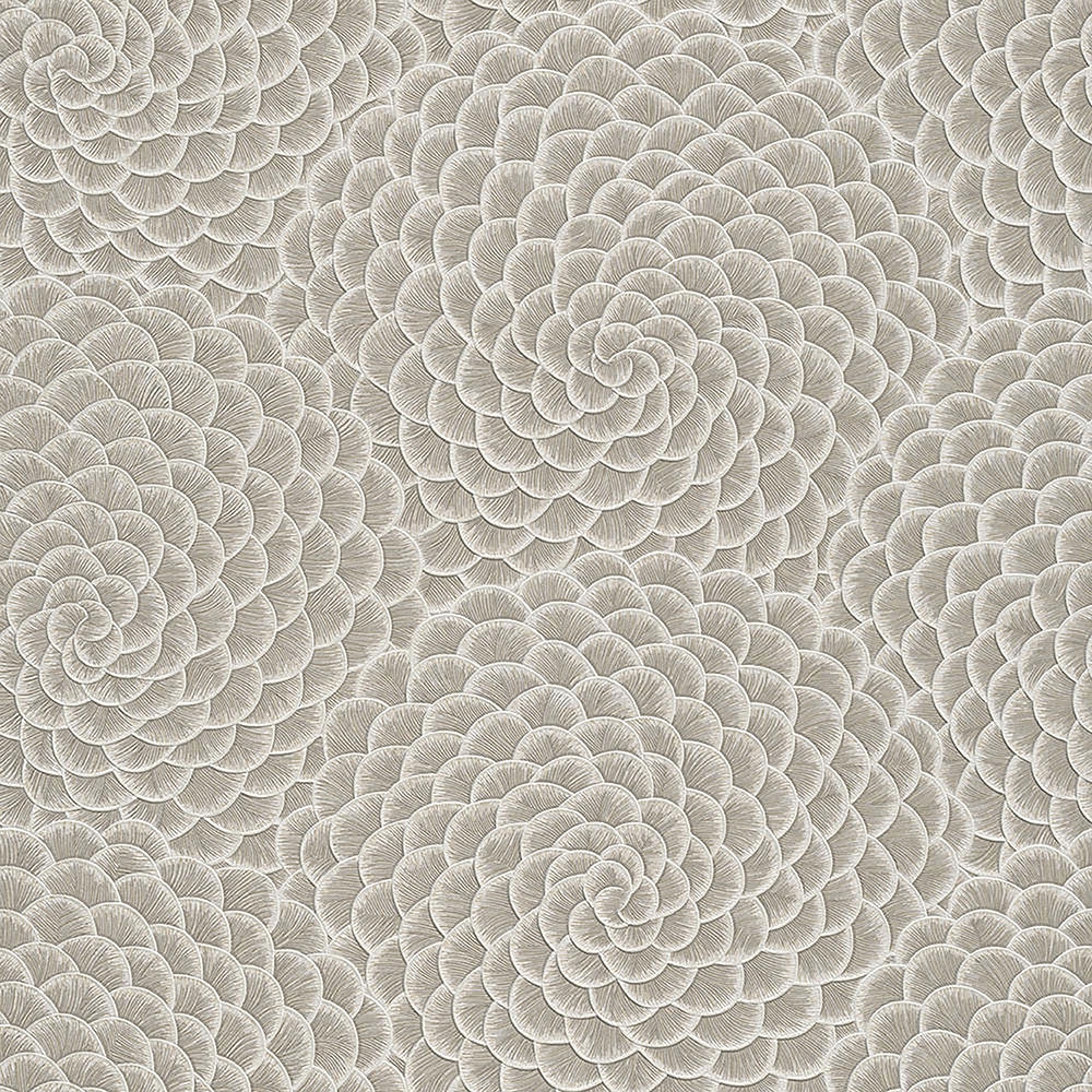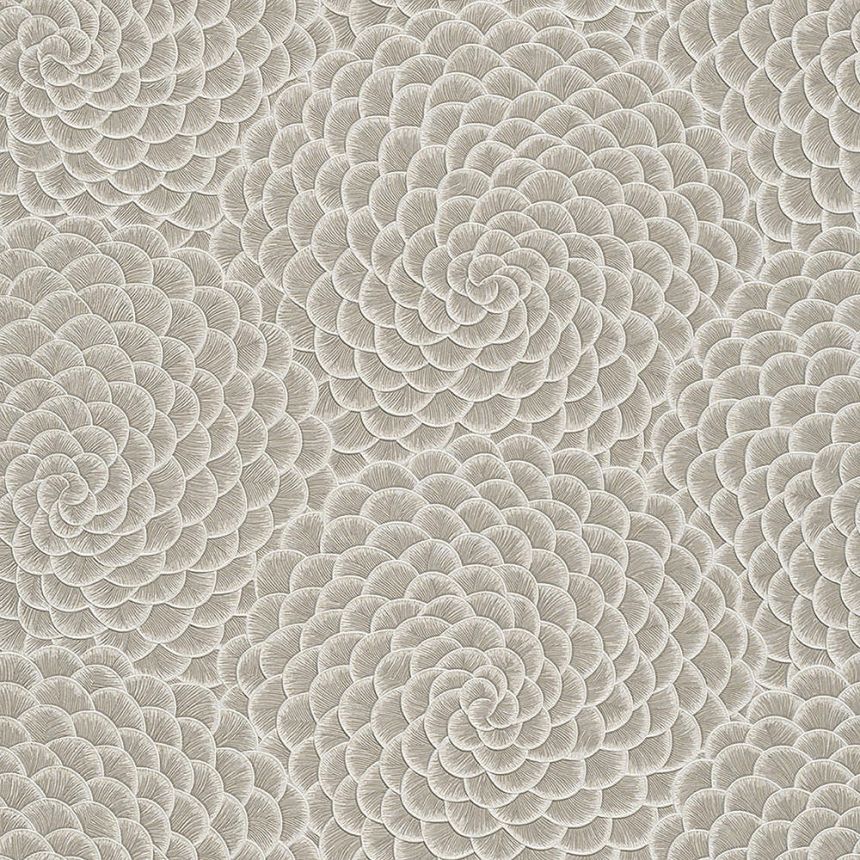 Vliesová tapeta s lístky květin. Šedo-béžová jemně plastická tapeta, okraje lístů bílá /perlový lesk.