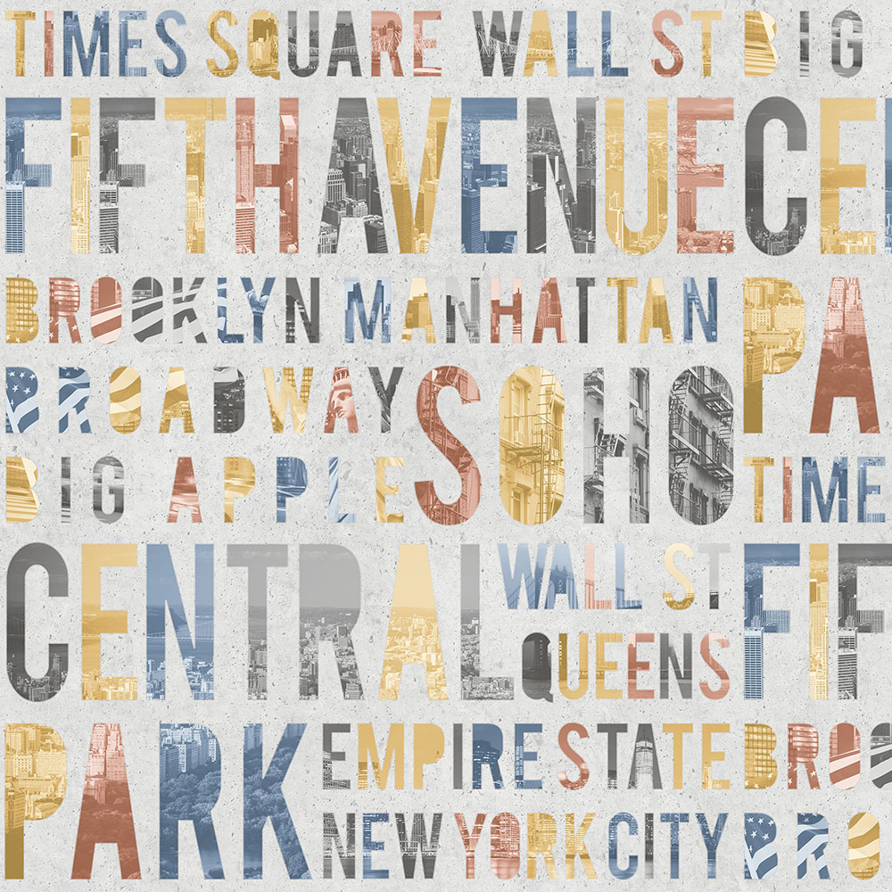 Šíře role 1,06 m. Plastická vliesová tapeta s omyvatelným vinylovým povrchem - motiv města, nápisy.
