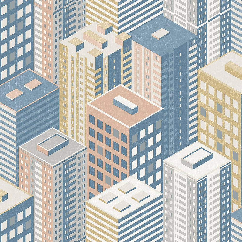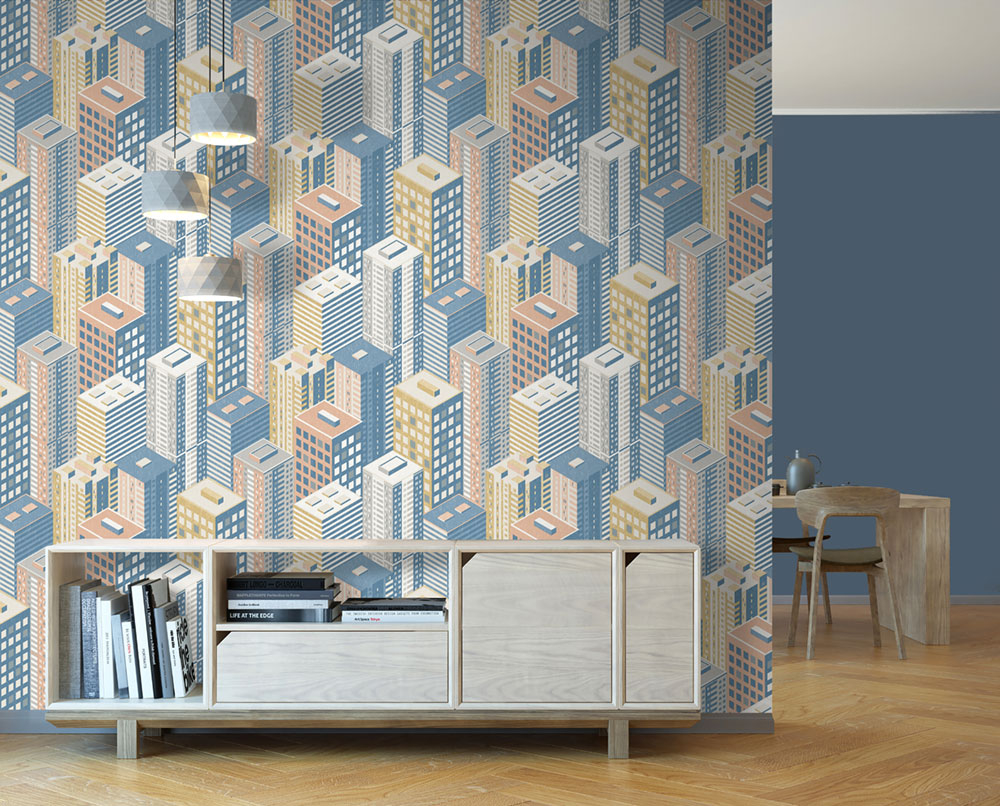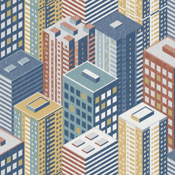 Šíře role 1,06 m. Vliesová tapeta s omyvatelným vinylovým povrchem - motiv velkoměsta, mrakodrapů.