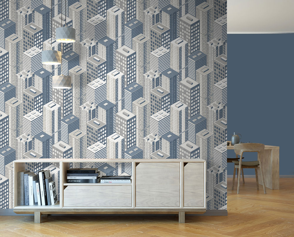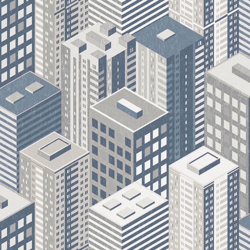 Šíře role 1,06 m. Vliesová tapeta s omyvatelným vinylovým povrchem - motiv velkoměsta, mrakodrapů.