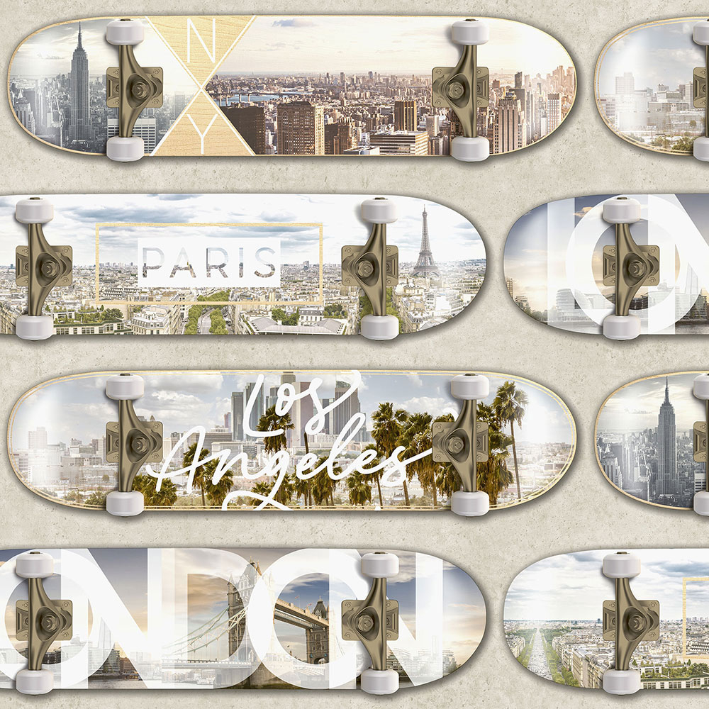 Šíře role 1,06 m Vliesová tapeta se skateboardy - města, nápisy - tapeta pro teenagery.
