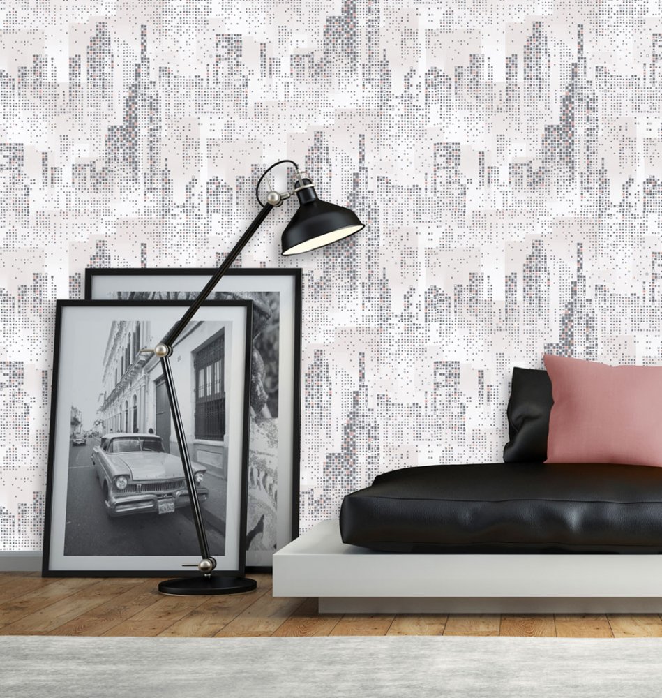 Vliesová grafická tapeta s omyvatelným vinylovým povrchem, motiv města, šedé metalické prvky.