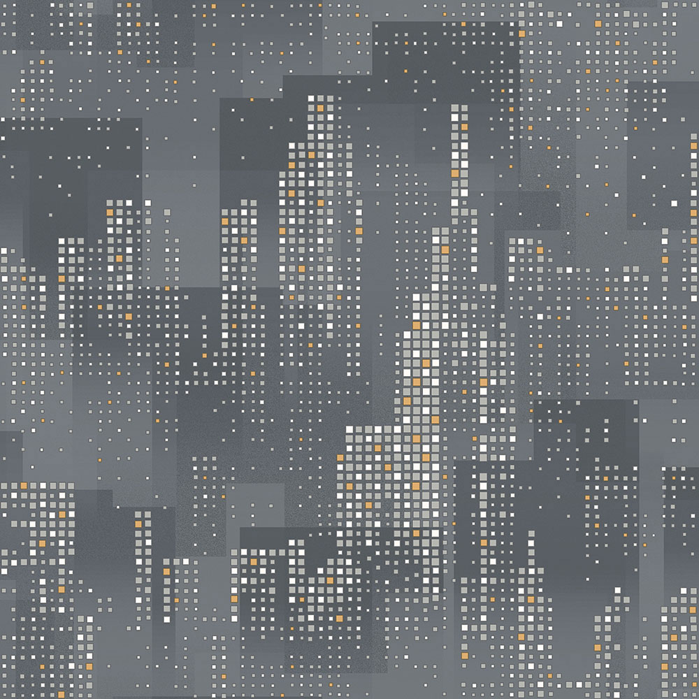Vliesová grafická tapeta s omyvatelným vinylovým povrchem, motiv města, odstíny šedé, stříbrné prvky.