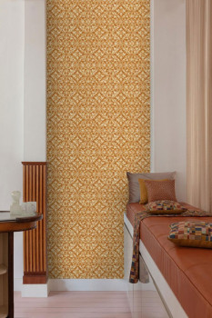 Vliesová, terakoto-krémová tapeta s ornamenty a stříbrnými detaily.