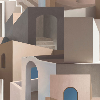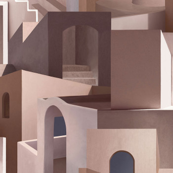 Působivá vliesová grafická tapeta s 3D prostorovým efektem, motiv podloubí, schodů, odstíny vínové a starorůžové.