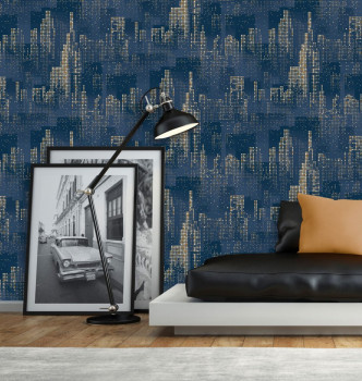 Vliesová modrá grafická tapeta s omyvatelným vinylovým povrchem, motiv města.