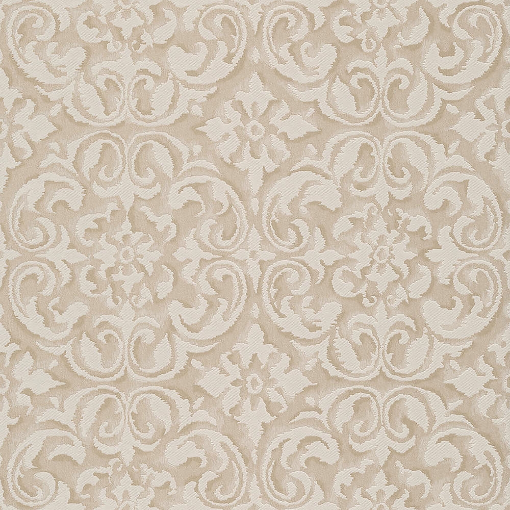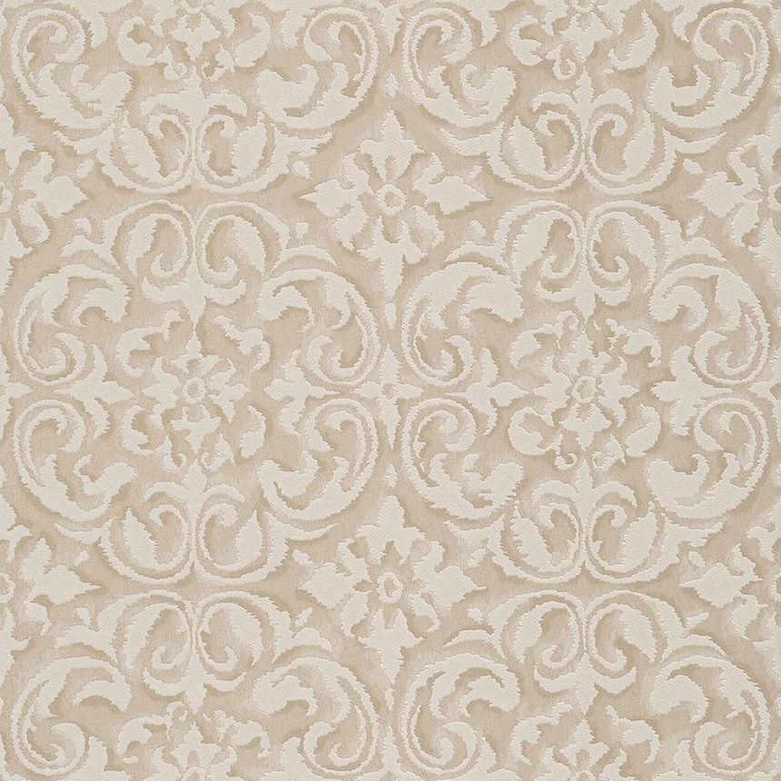 Vliesová, smetanovo-béžová tapeta s ornamenty a stříbrnými detaily.