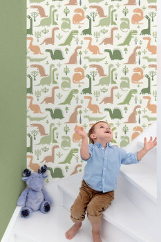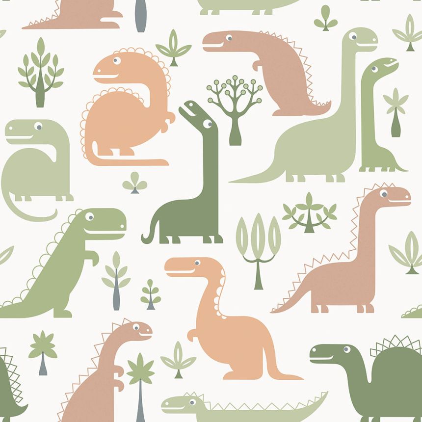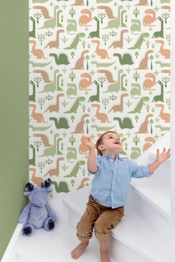Dětská vliesová tapeta s dinosaury - látková textura, odstíny zelené, hnědé a terakota.
