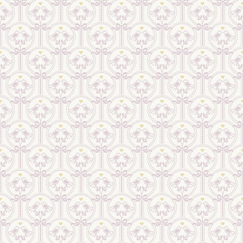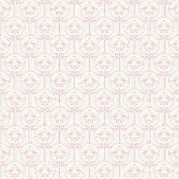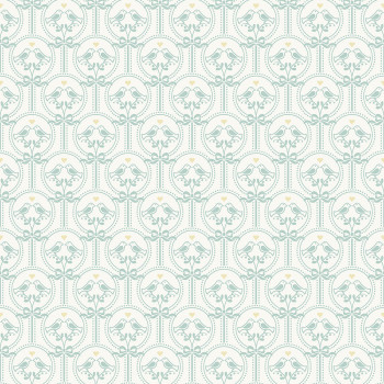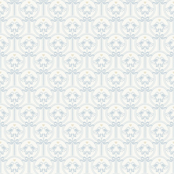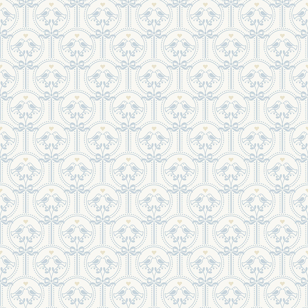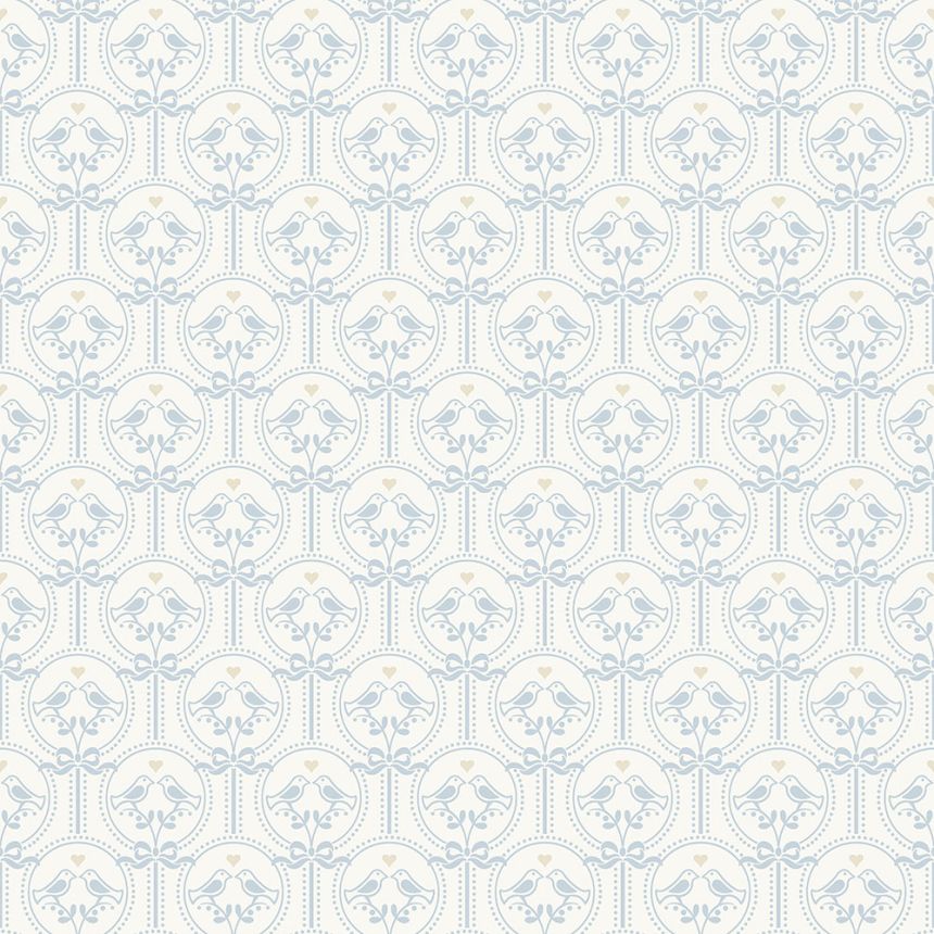 Dětská vliesová tapeta, bílý podklad, modrý ornamentální motiv ptáčků a mašliček. Tapeta má látkovou texturu, je vhodná do dětského pokojíčku.