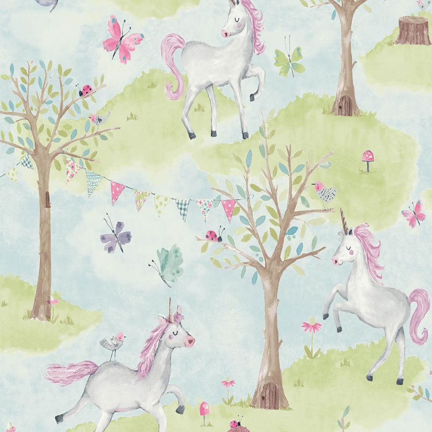 Vliesová tapeta do dívčího pokojíčku - bájní jednorožci ve snové romantické krajině. Podpořte fantazii Vašich dětí a vytvořte jim prostředí, kde se budou cítit dobře. Vliesová tapeta, struktura jemné tkaniny.