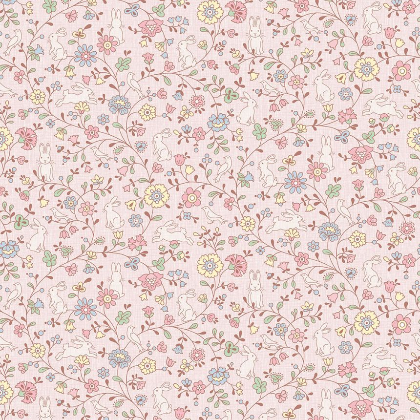 Růžová dětská vliesová tapeta, motivy kytiček a zajíčků. Tapeta má látkovou texturu, je vhodná do dětského pokojíčku pro nejmenší děti.