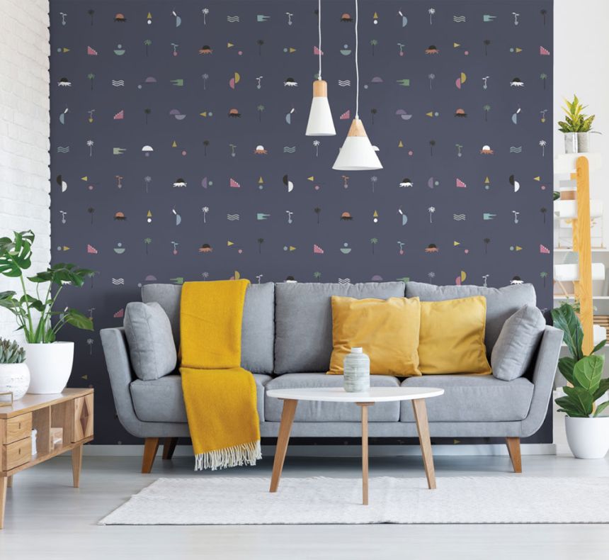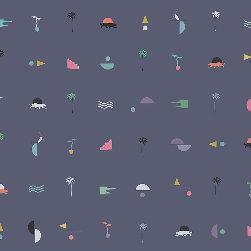 Tmavě modrá vliesová tapeta, motivy pantherů, palem.