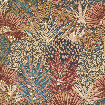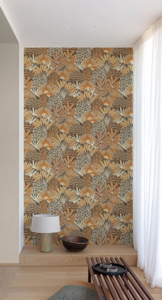 Rostlinné a přírodní motivy vnesou do interiéru klid a harmonii. Jemně strukturovaná vliesová tapeta s dekorem listů a květů v odstínech tmavě zelené, okrové, béžové a hnědé se zlatými třpytkami.