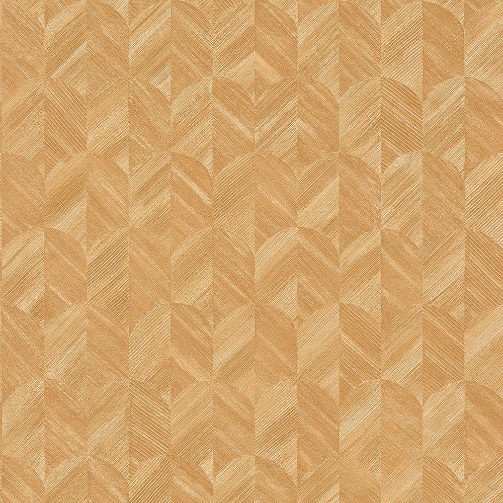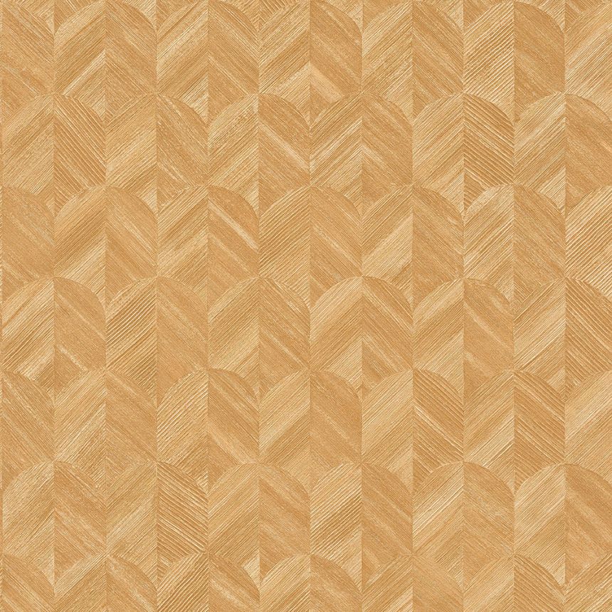Geometrická jemně strukturovaná okrová tapeta s jemnými zlatými odlesky.