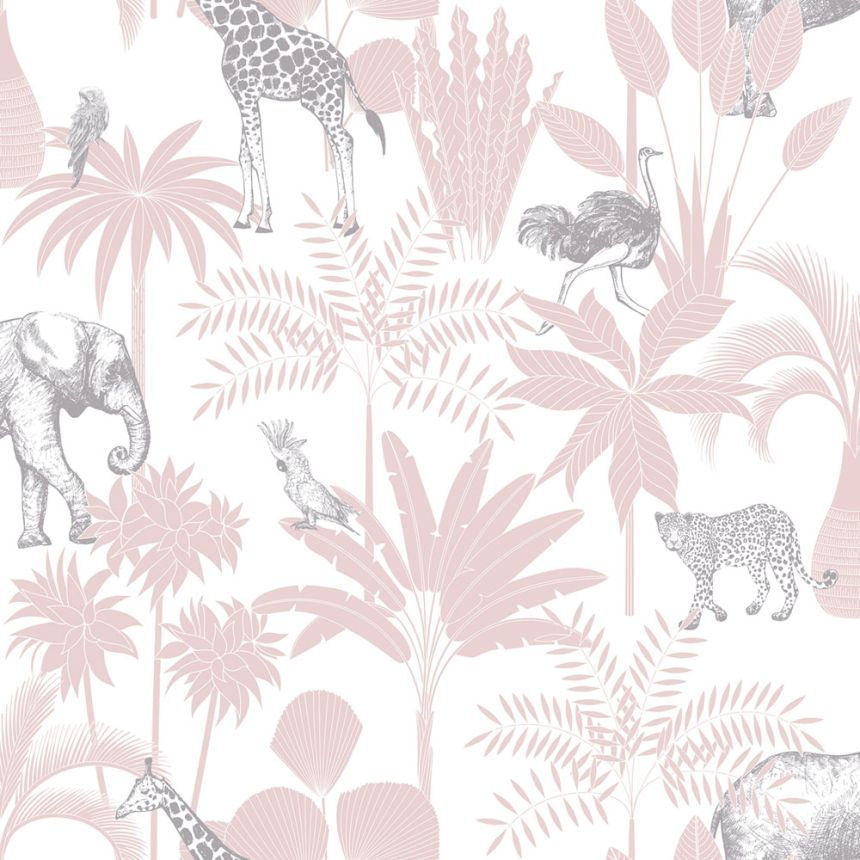 Růžová vliesová tapeta, bílé obrysy palmových listů. Tapeta vhodná do ložnice, obýváku, pracovny.