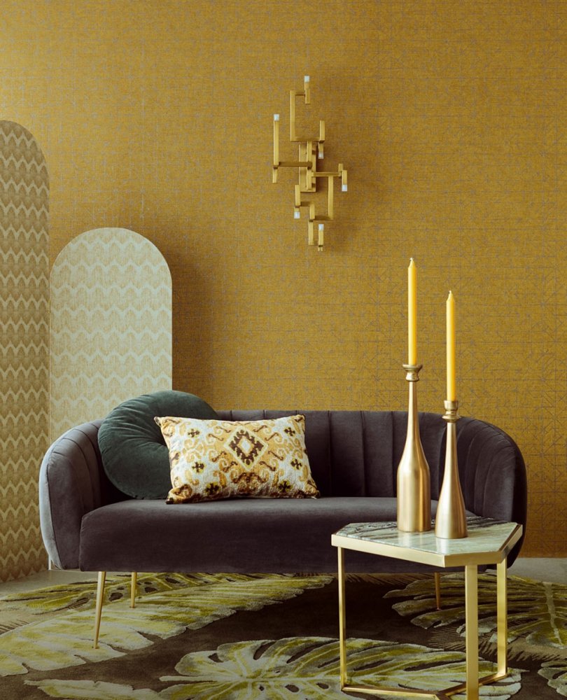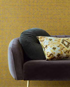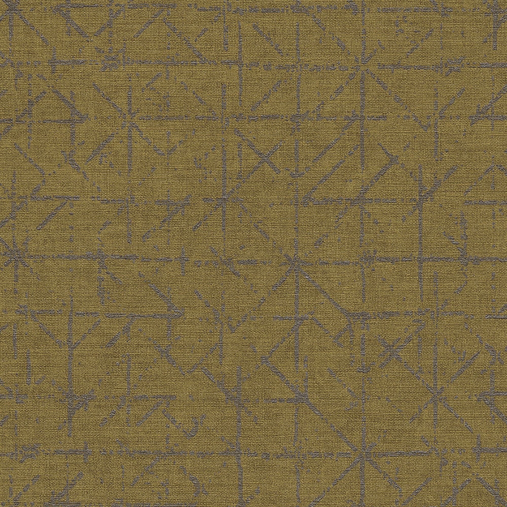 Vliesová tapeta s látkovou texturou. Metalický, částečně setřený, geometrický vzor na tmavě okrovém podkladu.