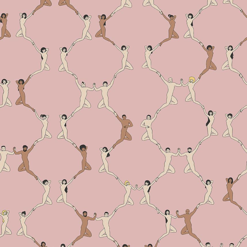 Růžová vliesová tapeta, motiv lásky - ornamenty z lidských postav.