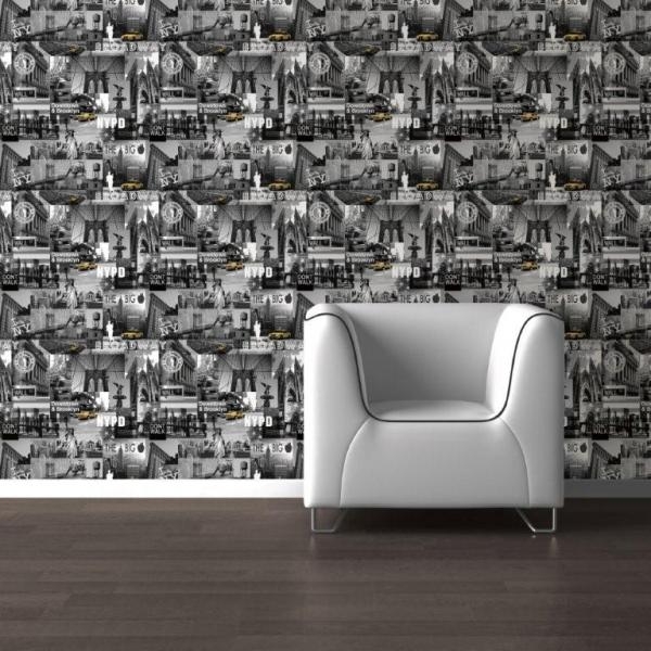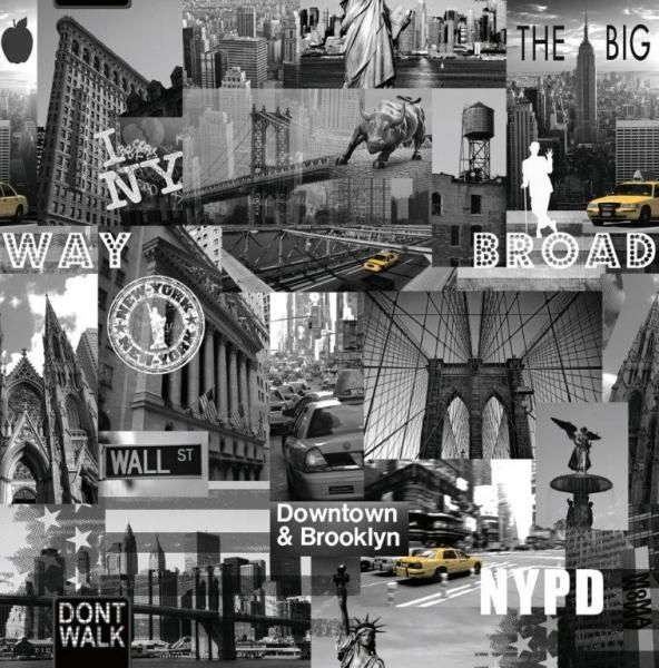 Papírová, vícebarevná tapeta s motivem New Yorku.
