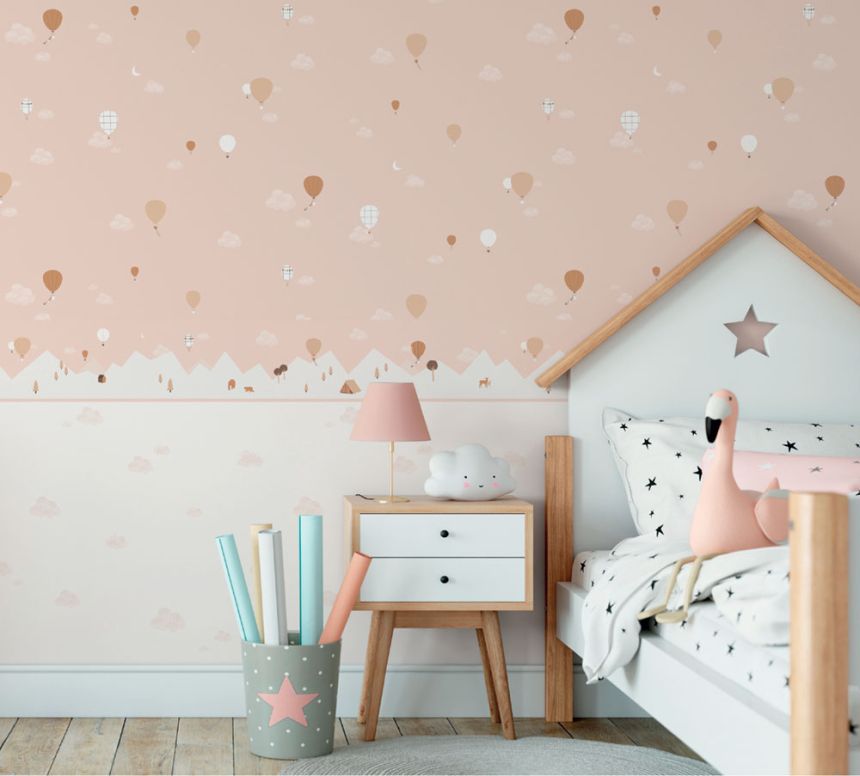 Růžová dětská samolepící bordura, hory, balony 7501-3, Noa, ICH Wallcoverings