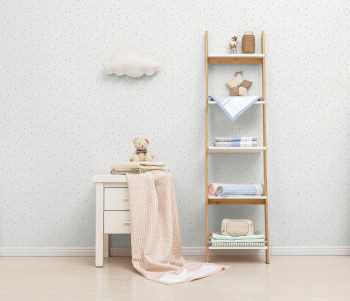 Bílá vliesová tapeta s drobnými šedo-modrými hvězdičkami. Tapeta vhodná do dětského pokojíčku.