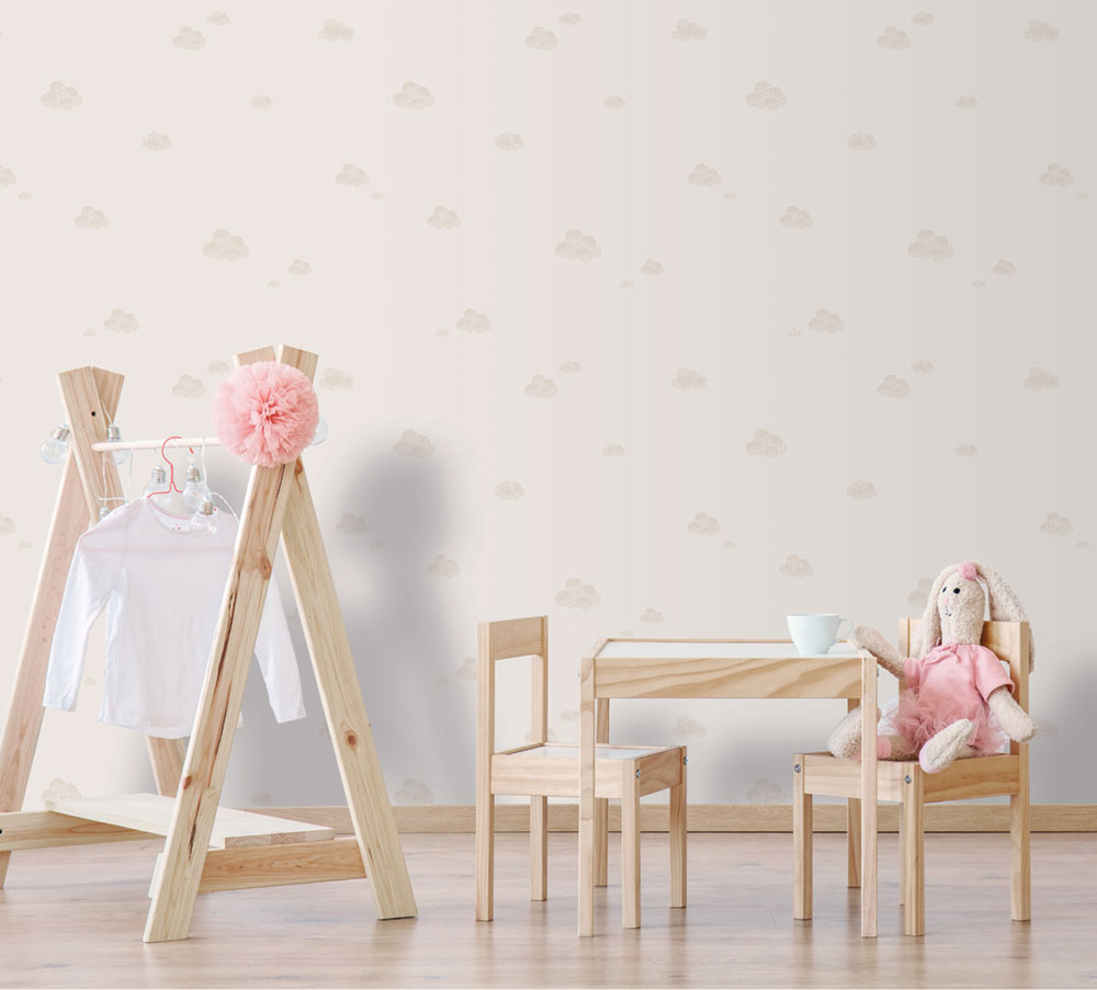Smetanově bílá vliesová tapeta do dětského pokojíčku, růžové mráčky.