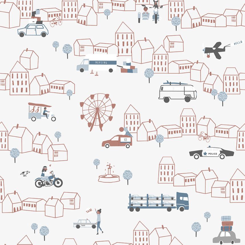 Dětská vliesová tapeta, tapeta pro kluky, motiv města, auta. Podklad smetanově bílá, vzor cihlově červená, modrá, černá.