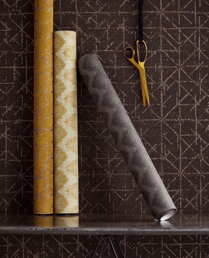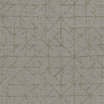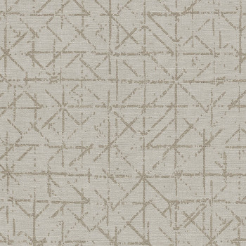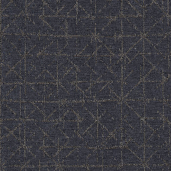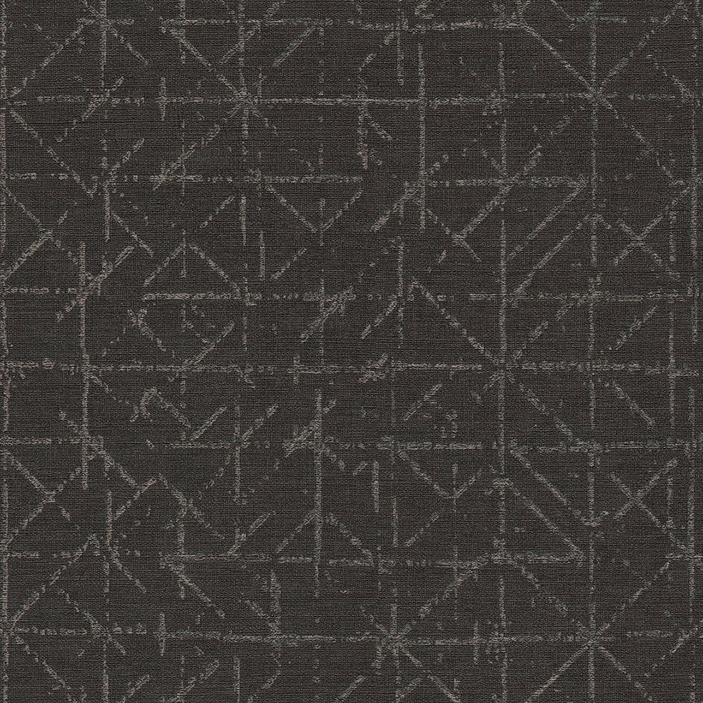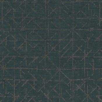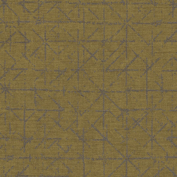 Vliesová tapeta s látkovou texturou. Metalický, částečně setřený, geometrický vzor na tmavě hnědém podkladu.