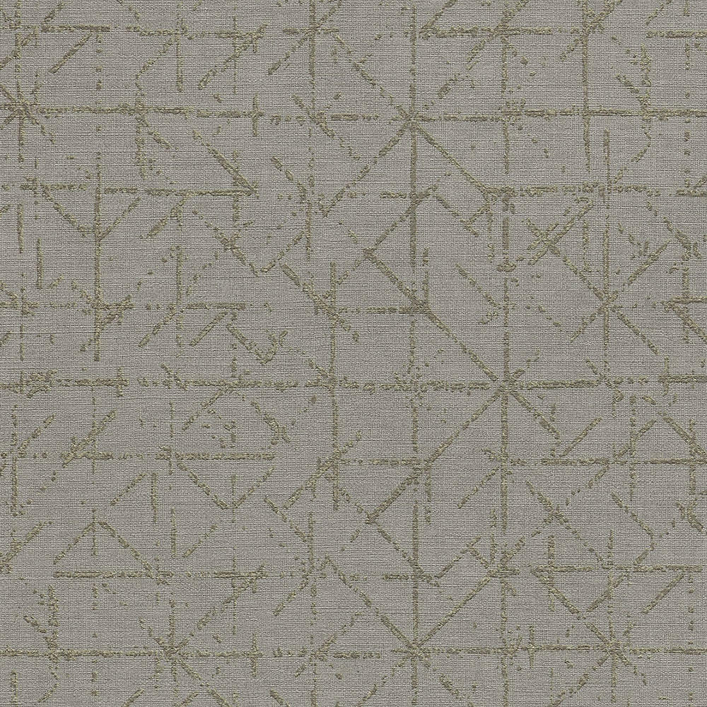 Vliesová tapeta s látkovou texturou. Metalický, částečně setřený, geometrický vzor na šedém podkladu.