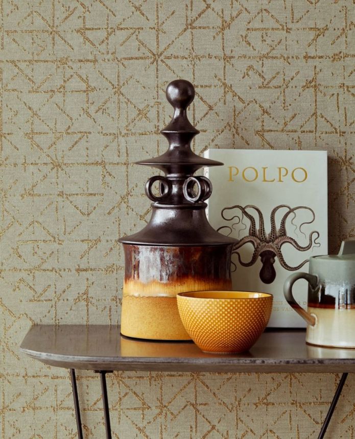 Vliesová tapeta s látkovou texturou. Metalický, částečně setřený, geometrický vzor na šedo-béžovém podkladu.